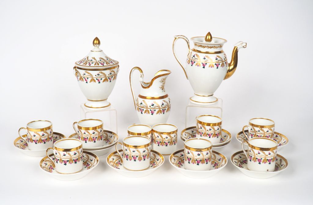Partie de service à café XIXème en porcelaine de Paris, blanche, et de fleurettes polychromes comprenant : - Une cafetière. - Un pot à lait. - Un sucrier. - 10 tasses et sous tasses. (accident à une anse de tasse, prise du sucrier cassée restaurée).