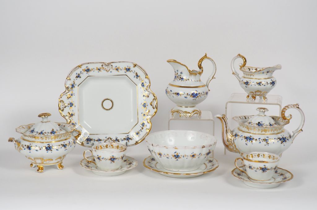 Partie de service à thé en porcelaine de Paris à décor polychrome et doré de fleurettes. Monogrammée D.P. Comprenant : - 1 théière ( fel et égrenure) - 1 sucrier - 1 pot à lait - 1 verseuse - 7 tasses et sous-tasses - 2 plats à gateaux - 1 compotier