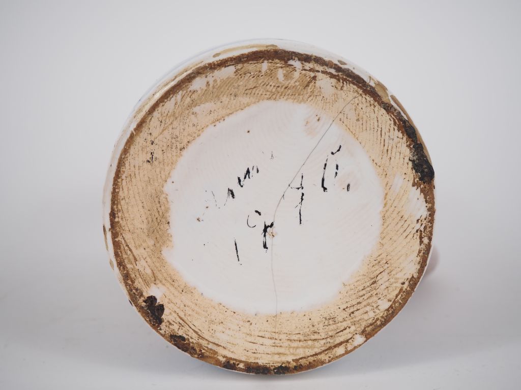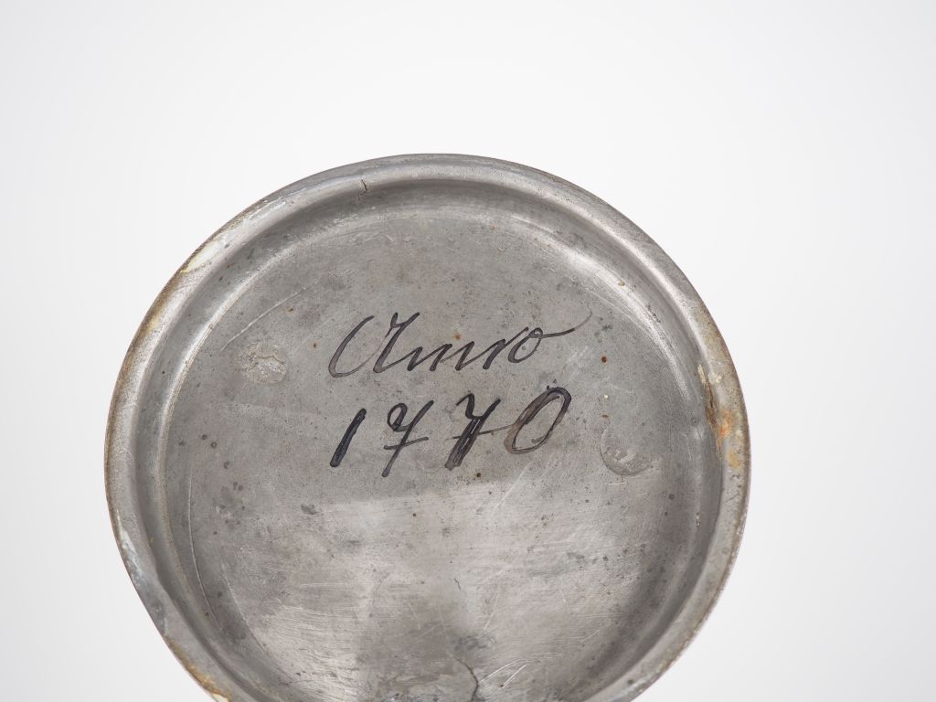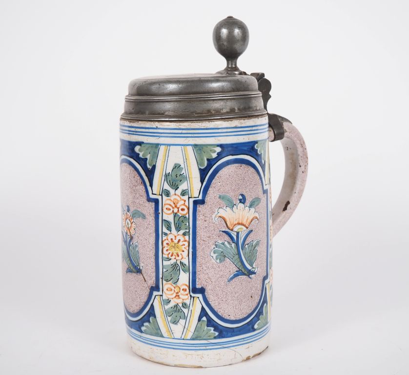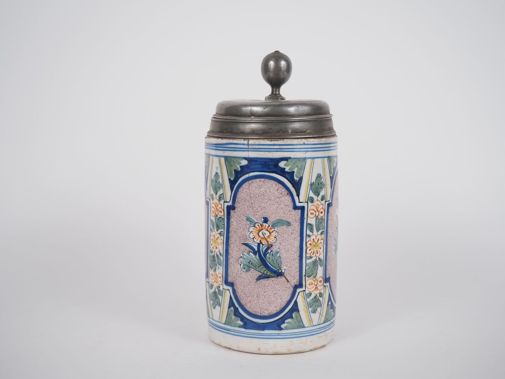 Pichet à bière XIXème en faience polychrome à décor de fleurs, couvercle en étain (fel). H. 26 cm