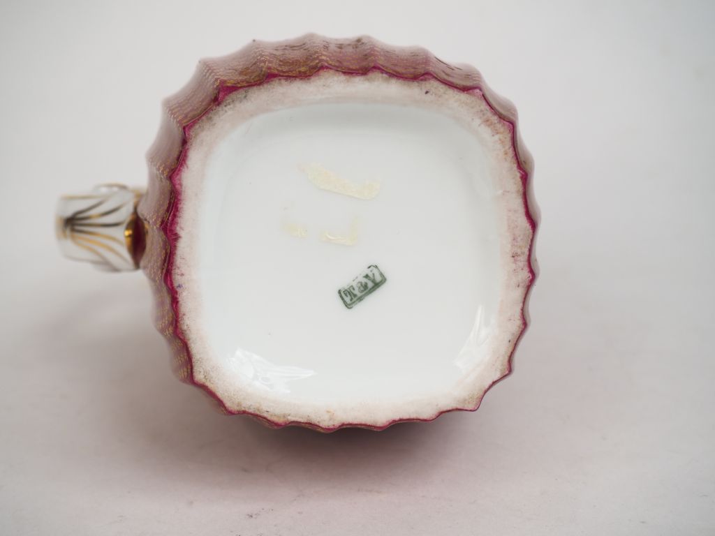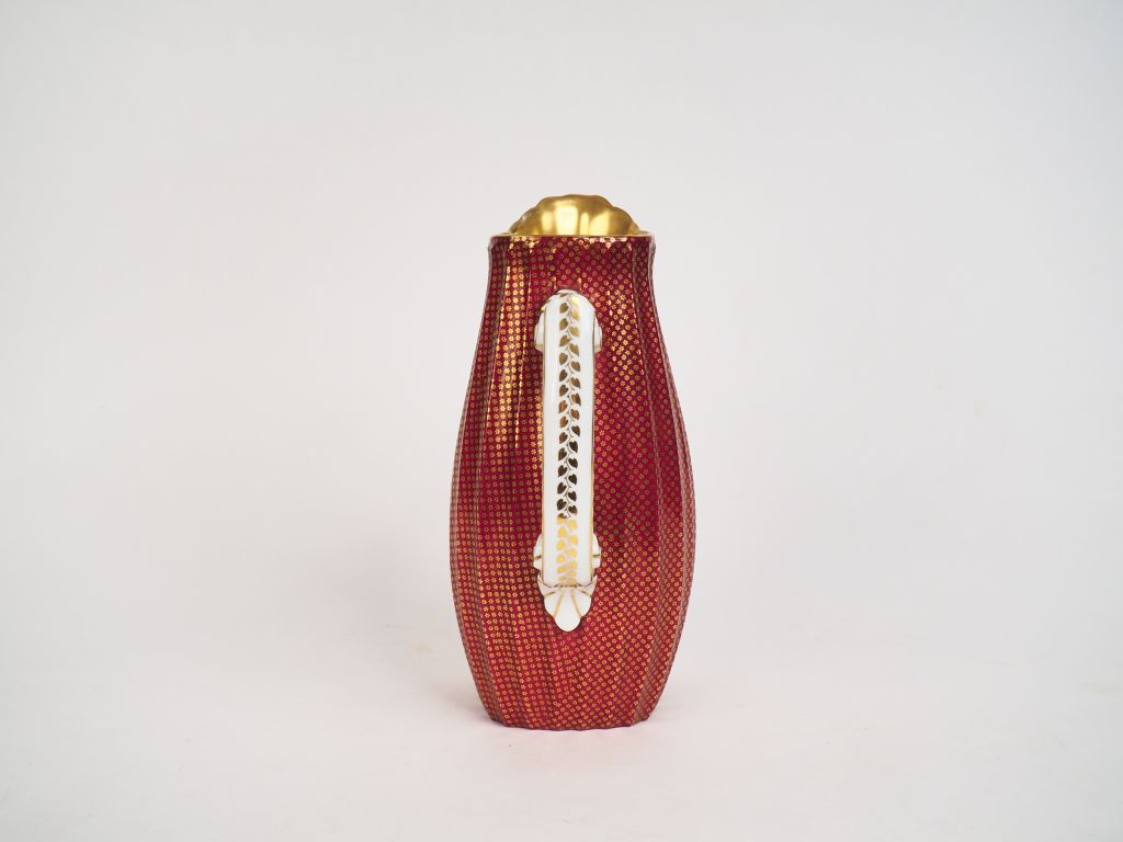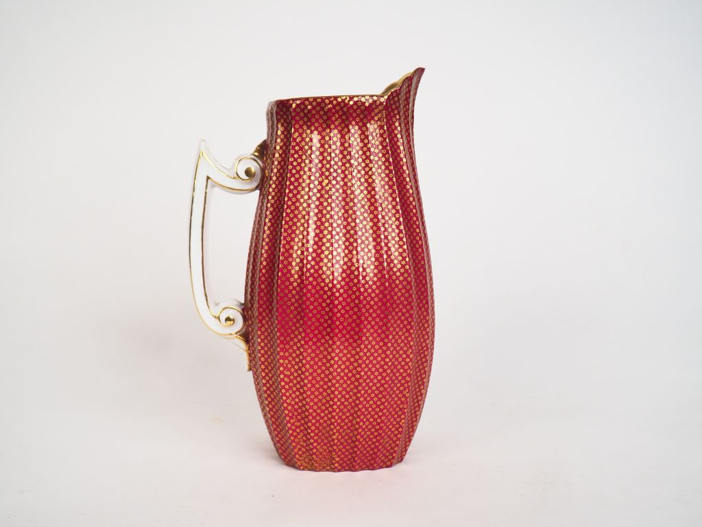Pichet de style Louis XVI en porcelaine, à décor de fleurettes sur fond rouge. H. 24 cm