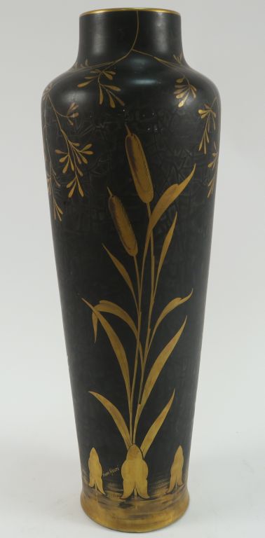PINON HEUZÉ à Limoges. Grand vase en céramique laqué noir, à décor doré de rapace, reptile et joncs. Signé. H. 52,5 cm
