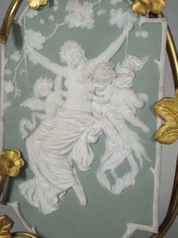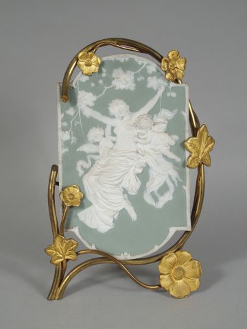 Plaque 1900 en Wedgwood "Nymphe et deux amours", monture Art Nouveau e...