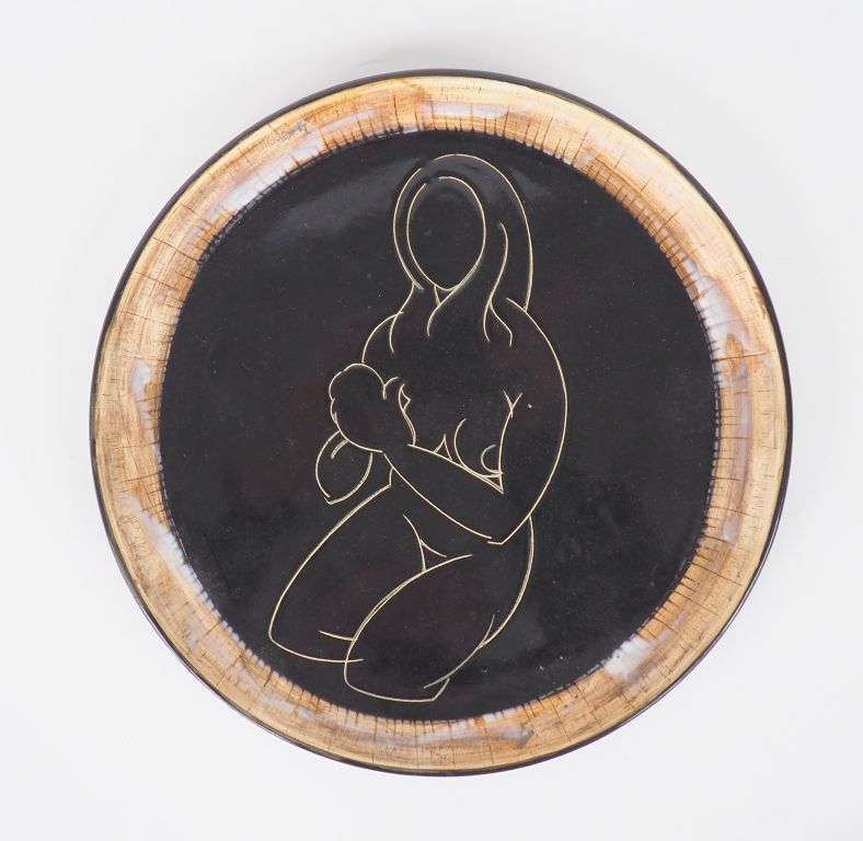 Plat 1960 en céramique polychrome à décor de jeune femme agenouillée. Signé au dos. Diam. 30 cm