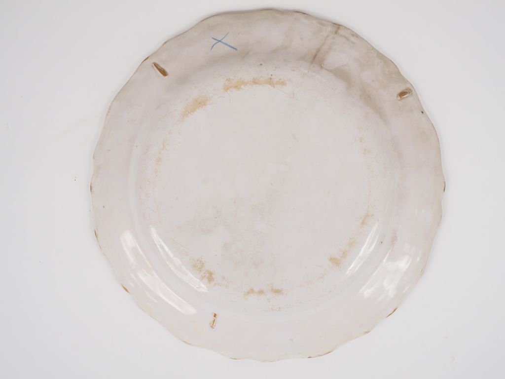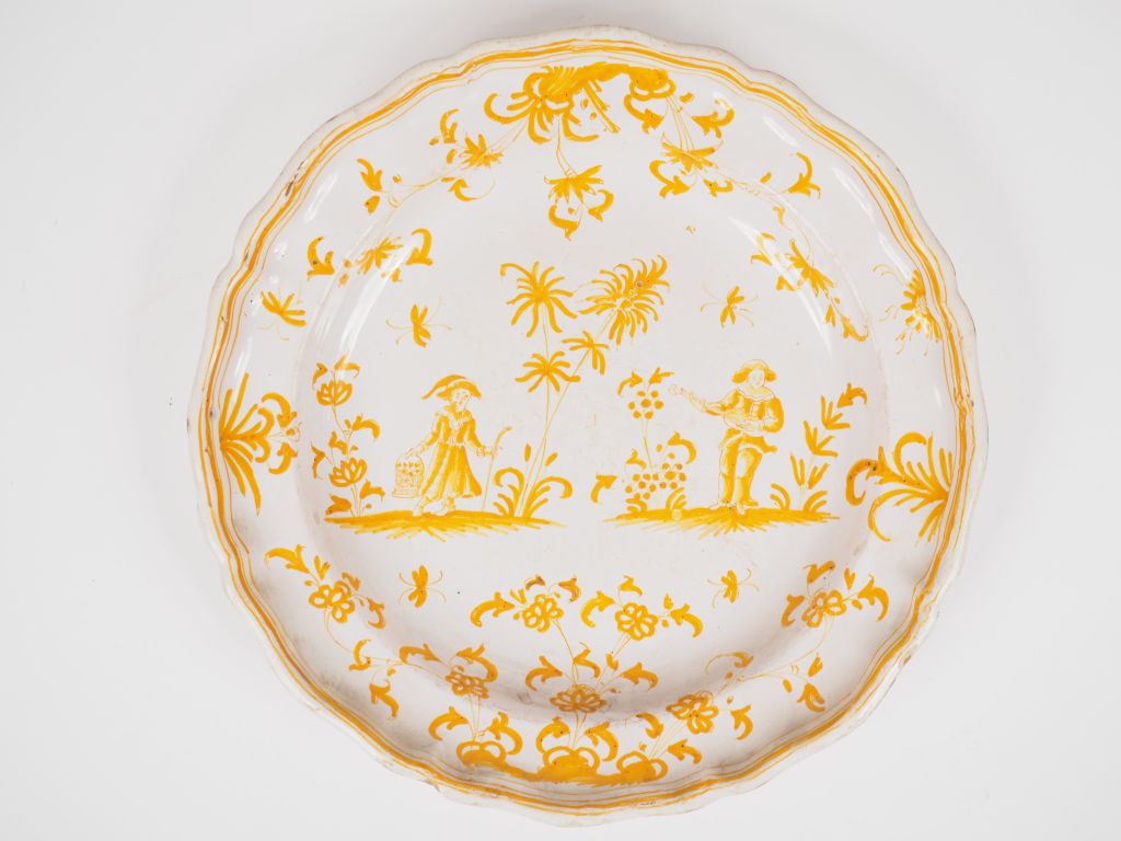 Plat XVIIIème en faïence de Moustiers, décor en camaïeu ocre de grotesques. Diam. 31 cm (petites égrenures)