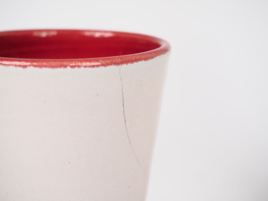 POL CHAMBOST. Service à orangeade en céramique blanche et polychrome comprenant : une cruche et 7 verres. (fel à un verre)