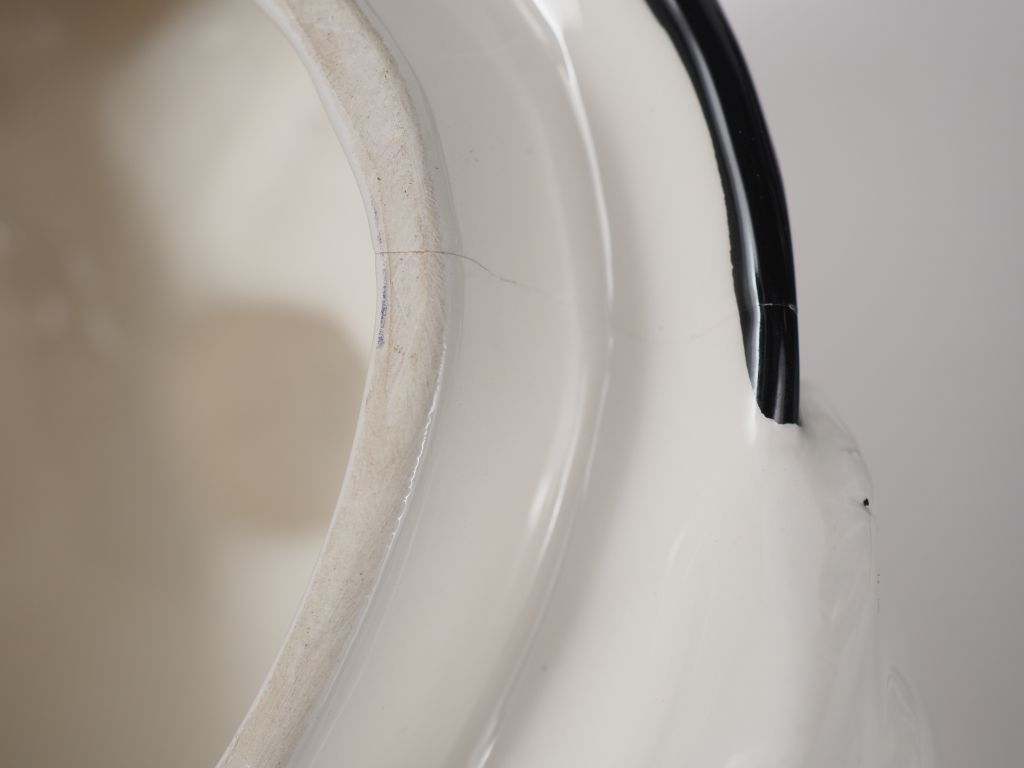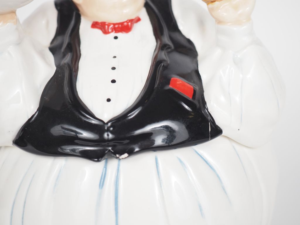 Pot couvert en céramique polychrome en forme de serveur jovial. H. 22,5 cm (fel, micro égrenures)
