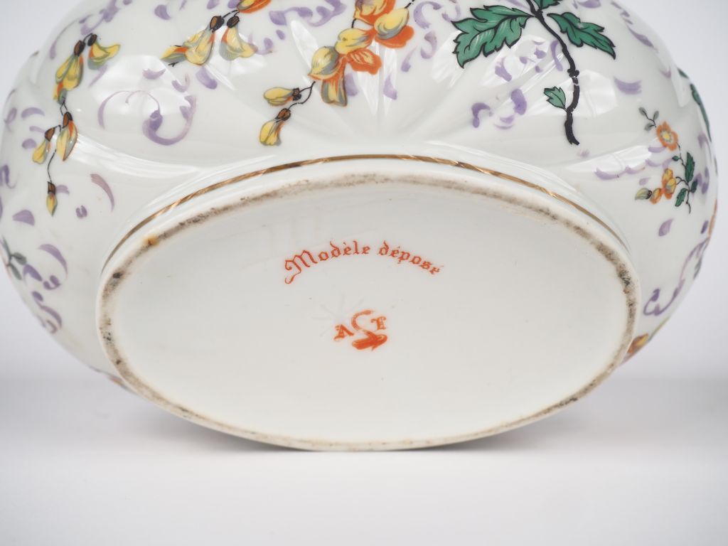 Pot couvert en porcelaine à décor de fleurs polychromes, en forme de coquillage. Signé. Dim. 16,5 x 17 x 12,5 cm.