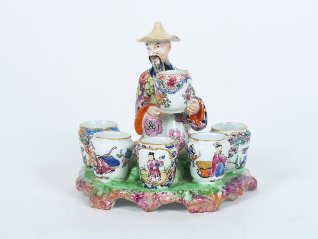 Pot d'aquarelliste en porcelaine polychrome par Samson à Paris, à décor de chinois (6 récipients) H. 14 cm