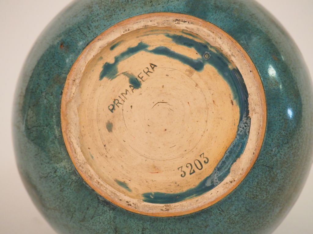PRIMAVERA. Vase boule à cinq cols en céramique turquoise flammée. Signé H. 24 cm