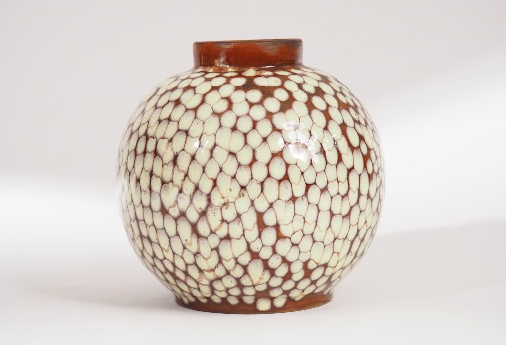 RENOLEAU. Vase boule en céramique tachetée de points blancs sur fond brun. H. : 17,5 cm.