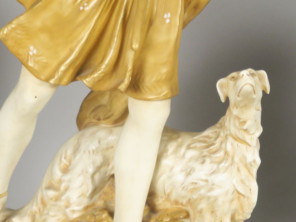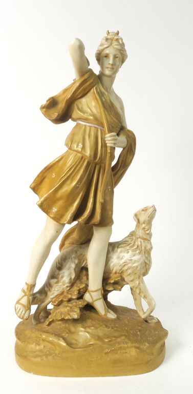 ROYAL DUX. Sculpture en porcelaine blanc crème et dorée "Diane chasseresse" Signée. H. 64 cm