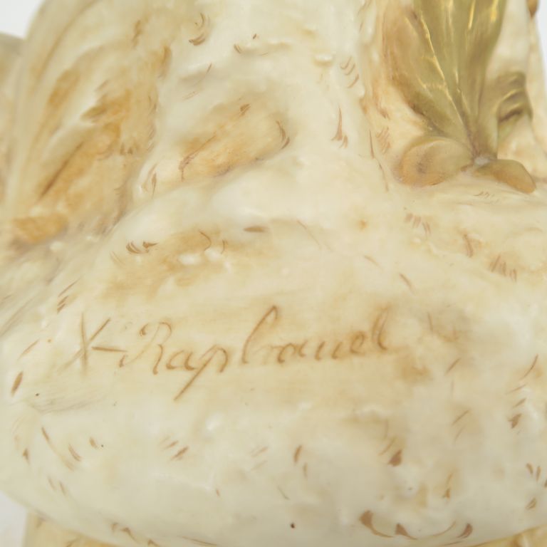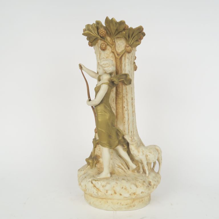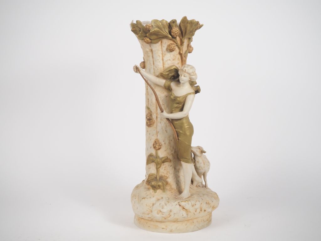 ROYAL DUX. Vase 1900 en biscuit à décor en rondebosse figurant une jeune bergère et sa brebis sur fond de branchages fleuris. Signé X. RAPHANEL H. 50,5 cm. (manque)