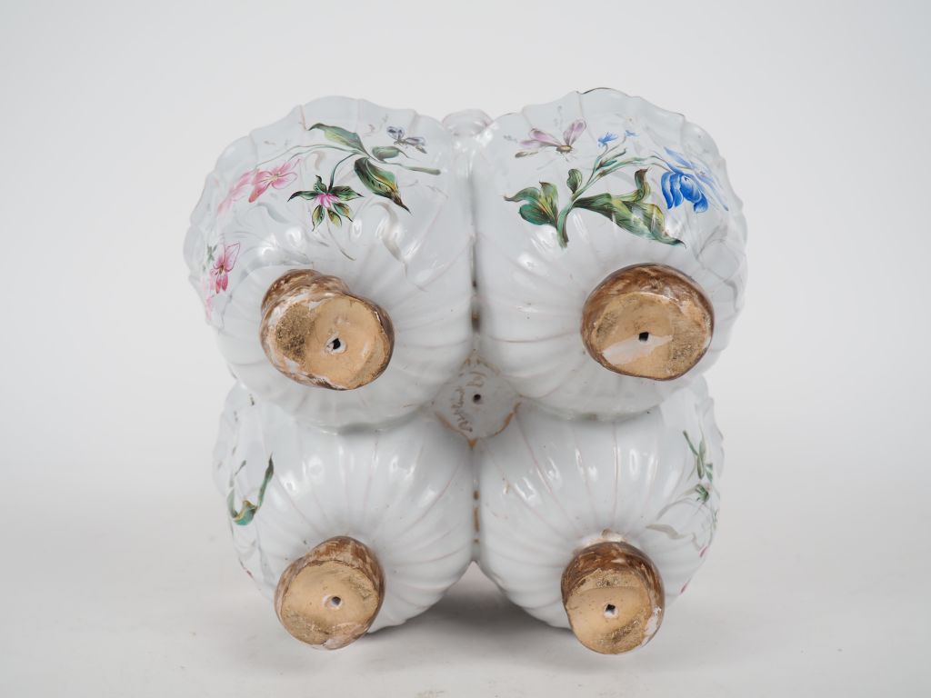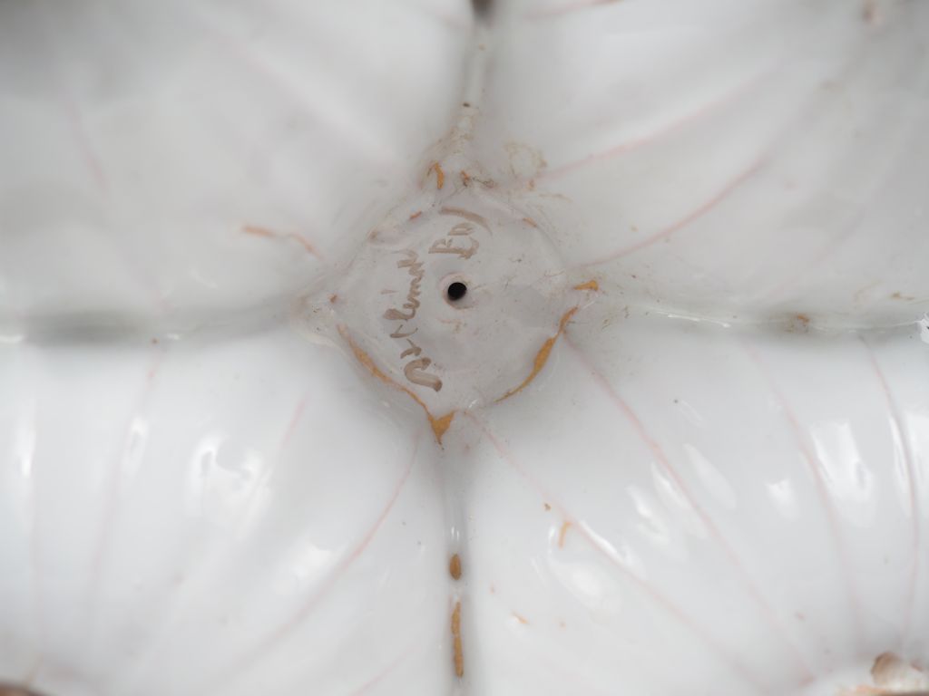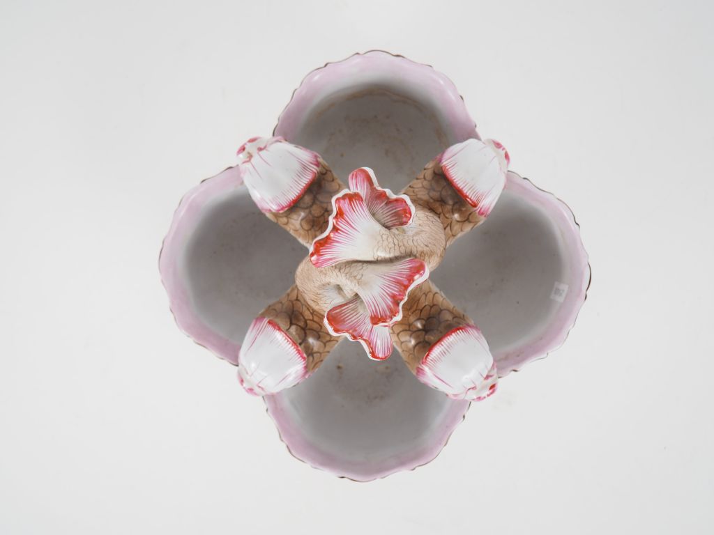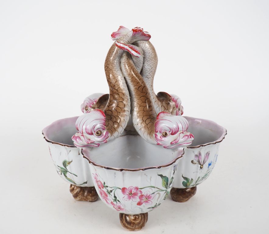 SAINT-CLEMENT-(GALLE pour). Grand présentoir en faience polychrome à décor de quatre dauphins, de fleurs et d'insectes. Dim. 28 x 23 cm