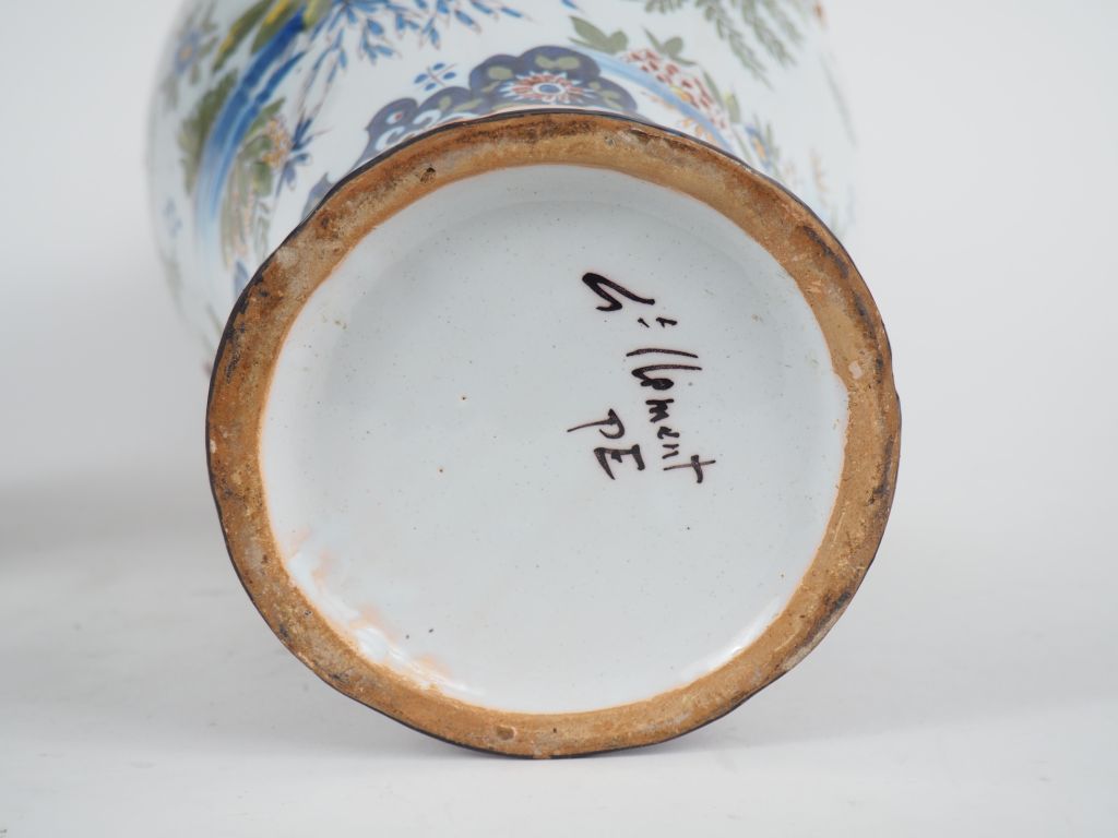 SAINT-CLEMENT. Paire de vases ovoides en faience à décor de fleurs polychromes et d'insectes. H. 40 cm.