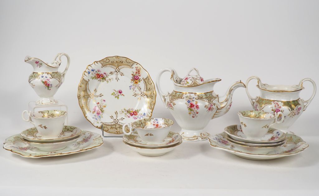 Service à thé et à gateaux en porcelaine anglaise 1900 à décor de fleurs polychromes et de rinceaux dorés comprenant 3 assiettes, 3 pièces de forme et 12 tasses et une jardinière en porcelaine Napoléon à décor polychrome d'amour et de fleurs (restaurations anciennes)