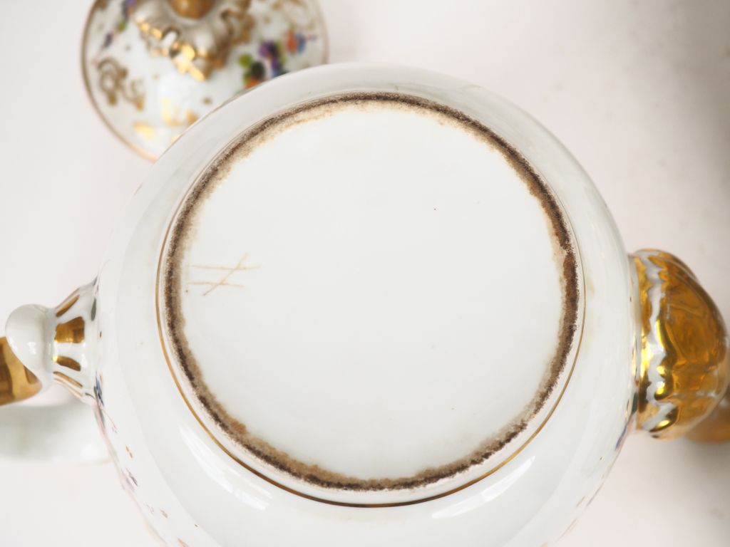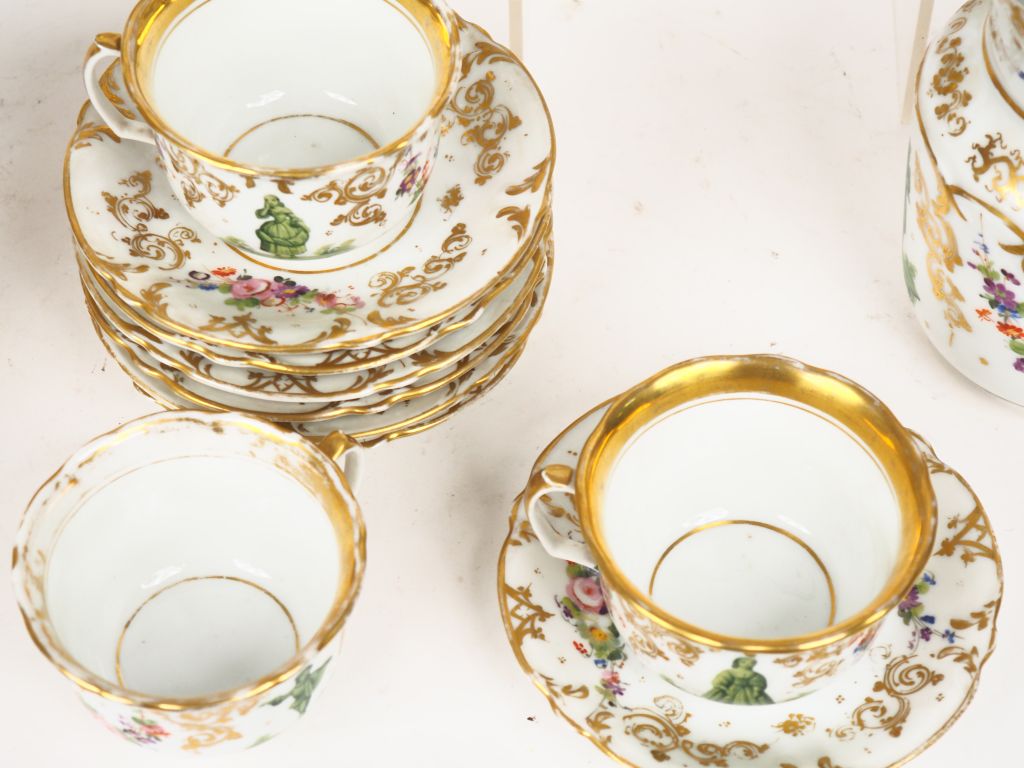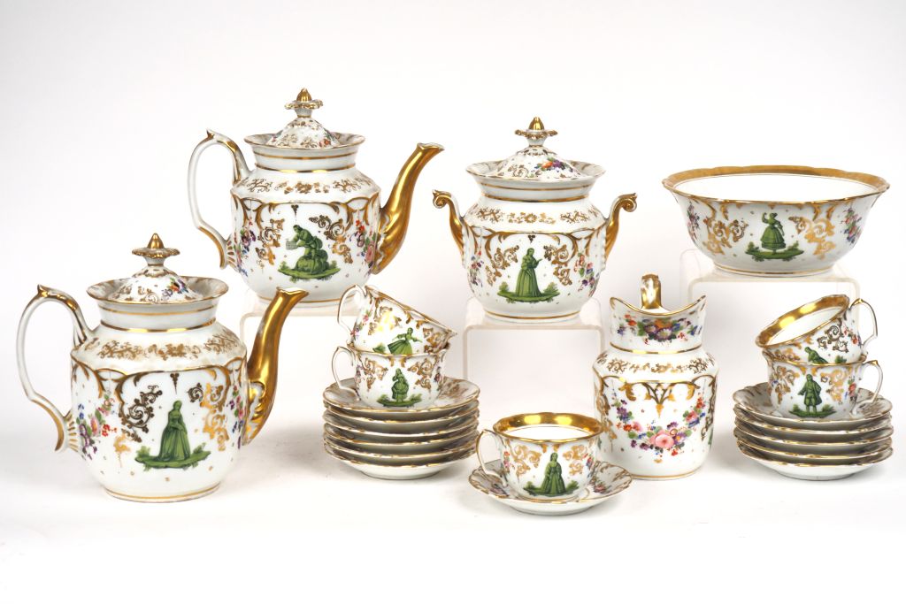 Service à thé Napoléon III en porcelaine de Paris, à décor de personnages verts, de guirlandes de fleurs polychromes et de rinceaux dorés : 5 pièces de forme, 12 tasses et sous tasses. (fel, égrenures et quelques manques de dorure)
