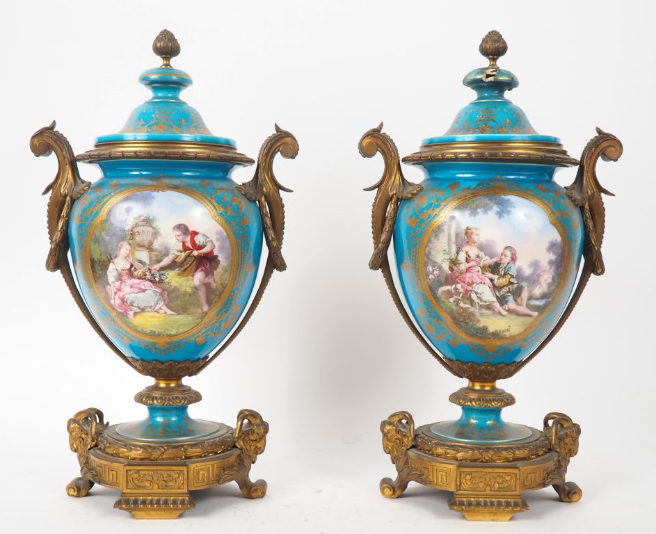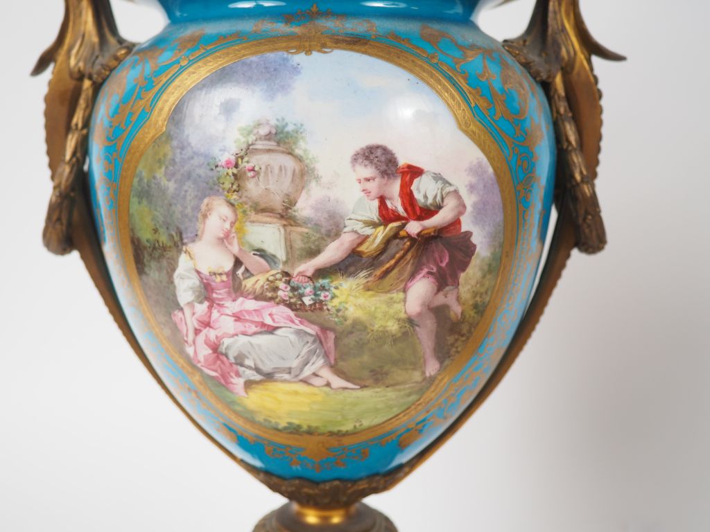 SEVRES. (?) Paire de vases en porcelaine de style Louis XVI, à décor dans des réserves de scènes galantes et bucoliques sur fond bleu roi rehaussé d'or , monture en bronze doré. (couvercle d'un vase accidenté et petits accidents au pied du même vase) H. 44 cm