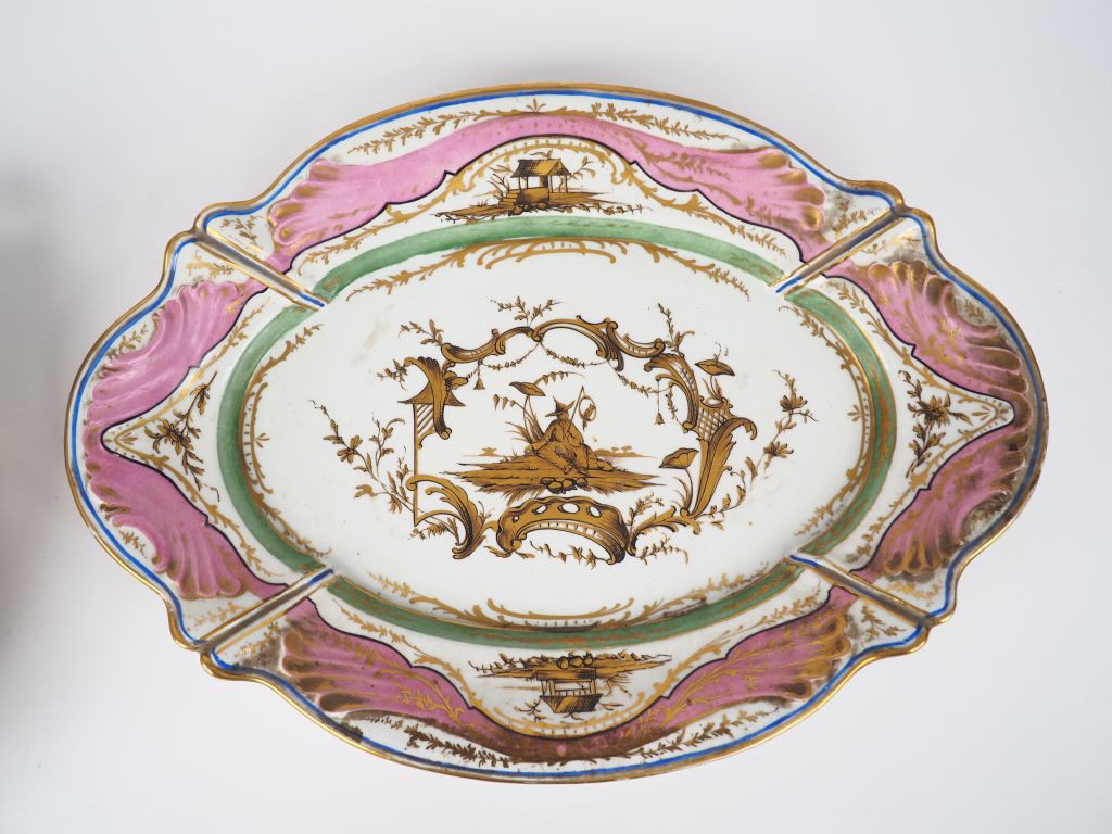 Soupière et son présentoir en porcelaine dans le gout de Sèvres à décor de chinoiseries, doré rose et vert.