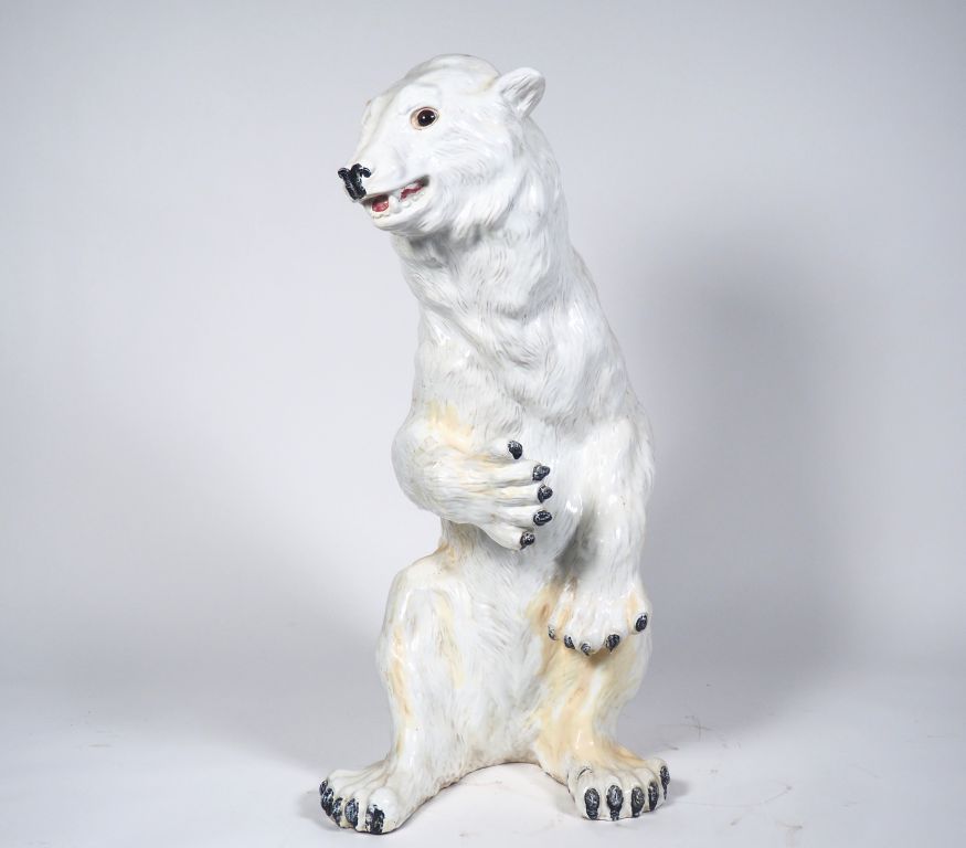 Spectaculaire sujet en porcelaine polychrome figurant ours blanc assis H. 108 cm