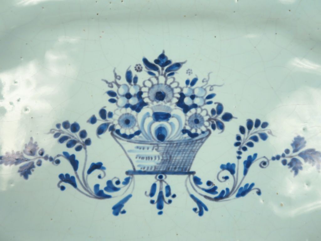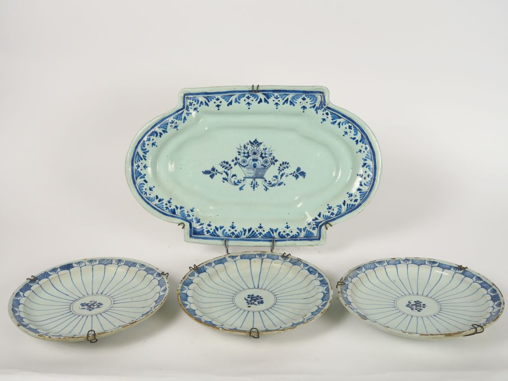 Suite de trois assiettes et un plat XVIIIème en faïence, décor en camaïeu bleu. (égrenures)