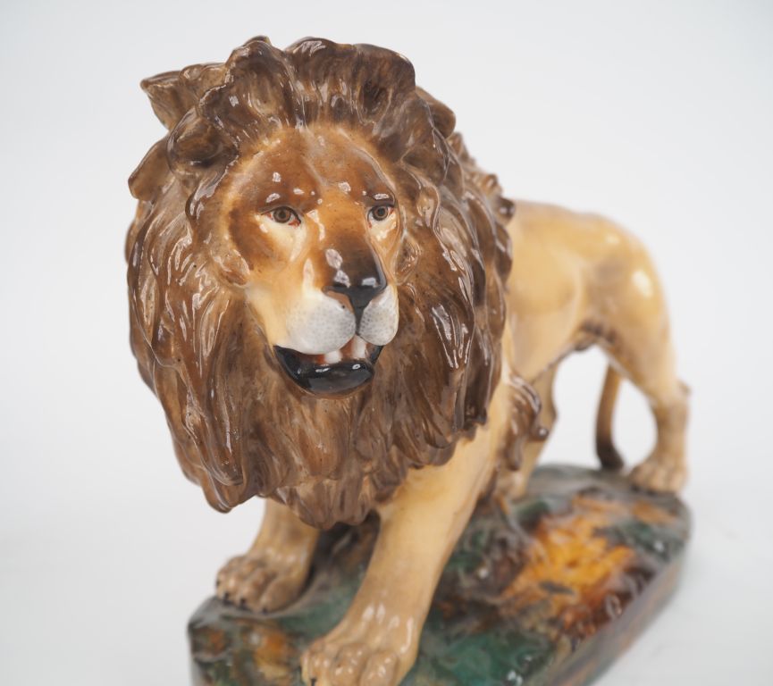 Sujet XIXème en céramique polychrome "lion marchant" Dim. 19 x 26 x 12 cm