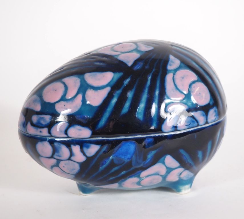 THARAUD. Boite en porcelaine de style Art Déco, en forme d'œuf à décor de motifs stylisés. Dim. 13 x 17 cm