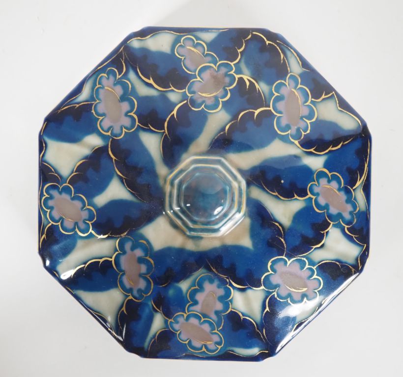 THARAUD. Bonbonnière Art déco en porcelaine de Limoges, à décor de fleurs et de feuillage bleu sur fond clair rehaussé d'or. Dim. 10 x 19 cm