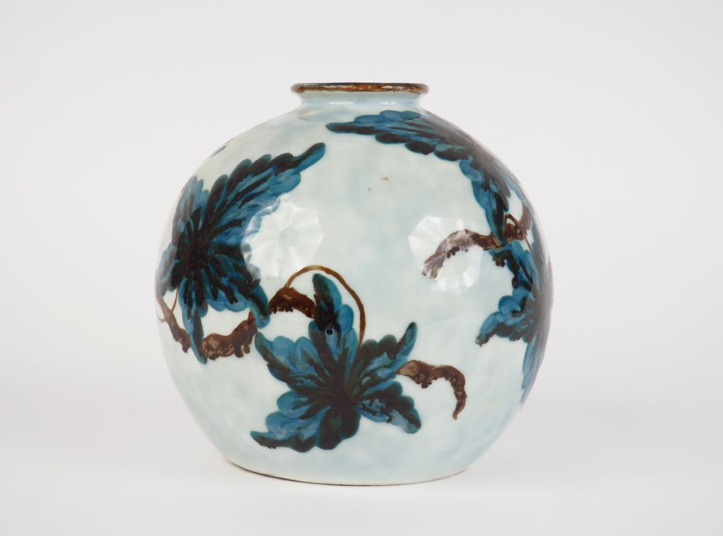 THARAUD. Vase boule en porcelaine de Limoges à décor polychrome de pampres. Signé. H. 19 cm
