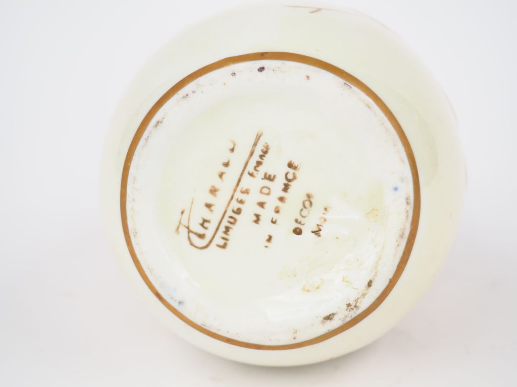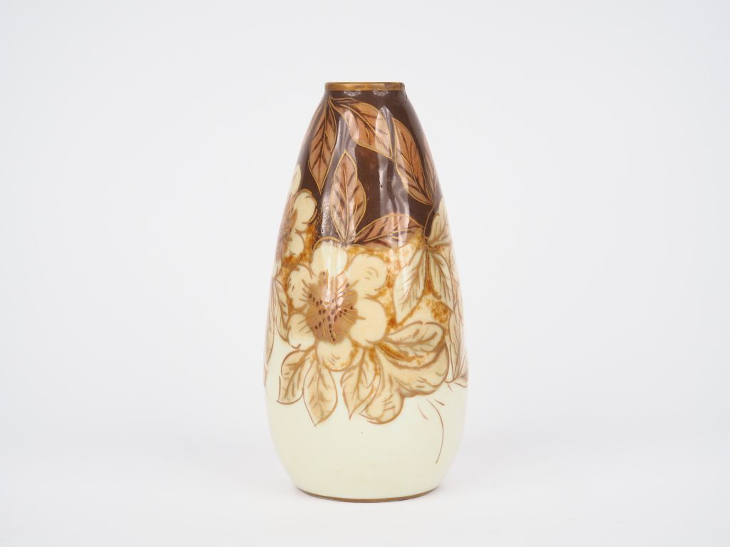 THARAUD. Vase ovoïde en porcelaine de Limoges à décor de fleurs et de feuillage brun et doré sur fond crème. Signé. H. 18,2 cm.