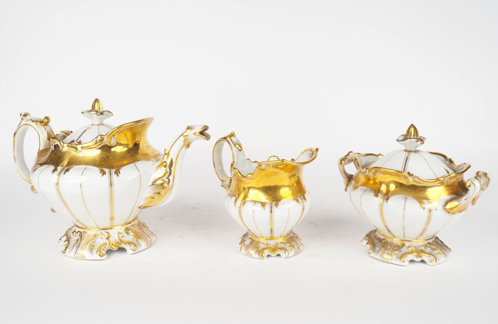 Théière, sucrier, pot à lait Napoléon III en porcelaine de Paris, blanche et dorée (prise du couvercle de la théière à recoller)