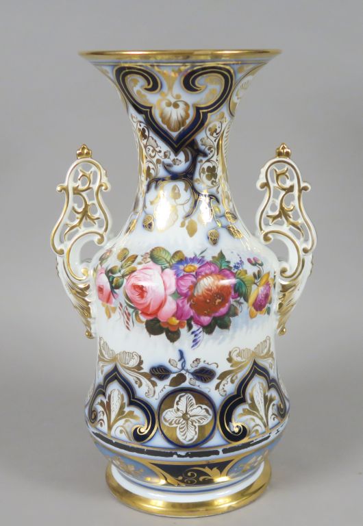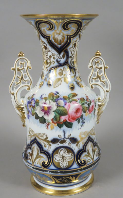 Vase à anses Restauration en porcelaine de Valentine ou de Bayeux, à décor de fleurs polychromes sur fond blanc rehaussé d'or et de bleu de four. Anses ajourées. H. 44,5 cm