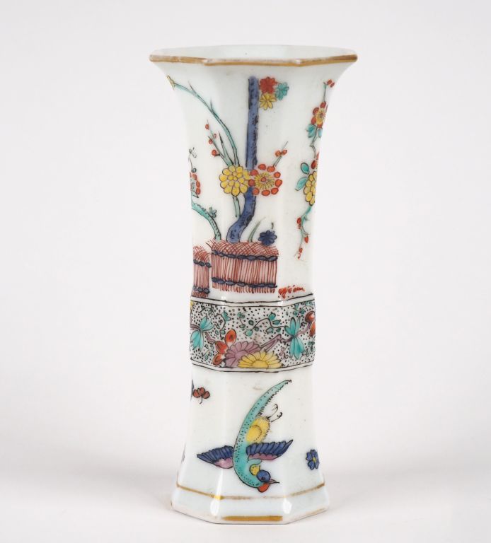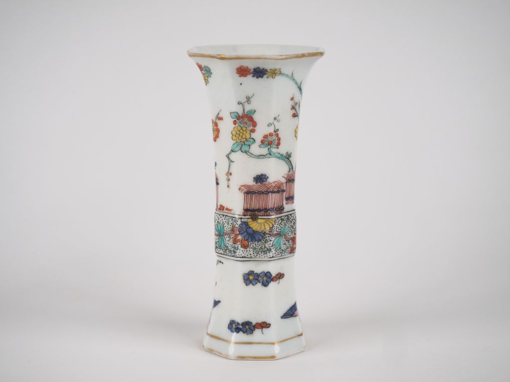 Vase cornet XIXème en porcelaine à décor Kakiémon. Signature à la trompe de chasse. H. 15,5 cm. (micro restauration).