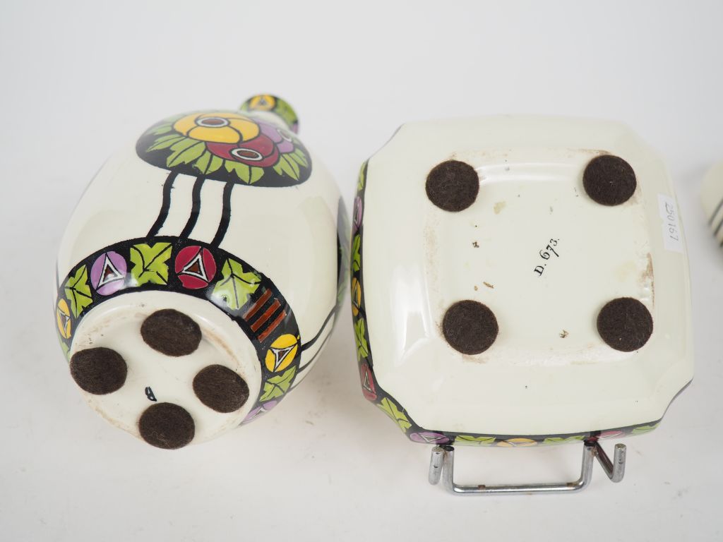 Vase et bonbonnière Art déco en faience fine à décor de fleurs polychromes dans des réserves et de liseré noir sur fond crème. H. vase : 22 cm. Dim. Bonbonnière : 9 x 13 x 13 cm.
