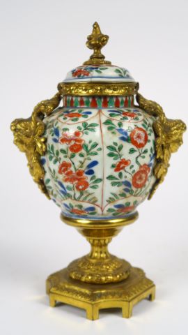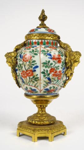 Vase monté en porcelaine de Chine, famille rose, monture en bronze doré à décor de jeune fille. H. : 21,5 cm. (Couvercle accidenté)