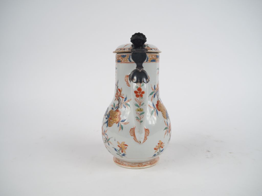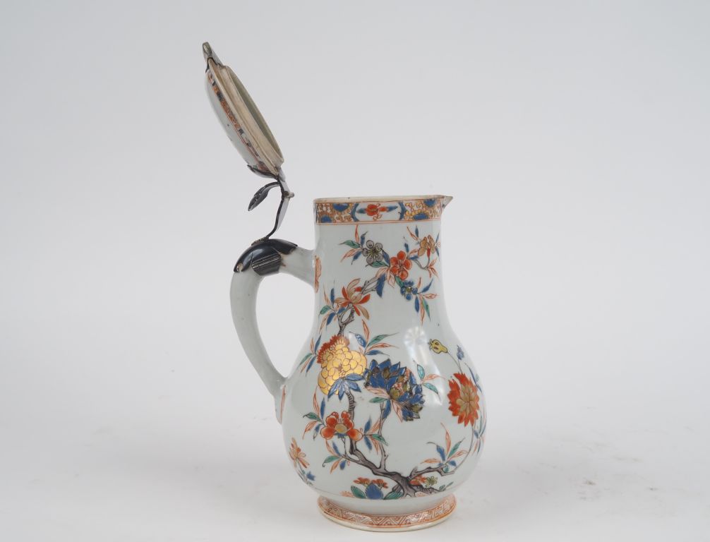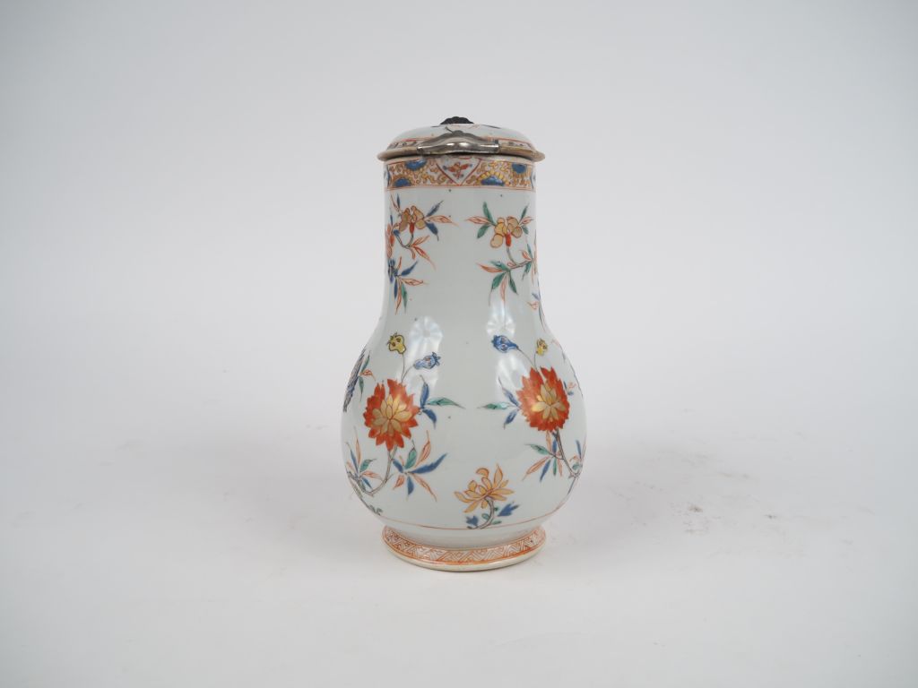 Verseuse XVIIIème en porcelaine de Chine famille rose, monture en argent (postérieure). (petite égrenure au bec, égrenures sur le couvercle) H. 21 cm