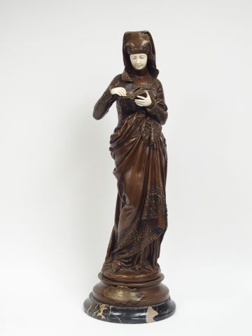 Carrier BELLEUSE (d'après), "La liseuse". Grande sculpture chryséléphantine. Socle en marbre portor. H. : 60 cm.