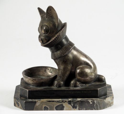 Christiane CHILLI "Chiot à la gamelle". Sculpture Art Déco en bronze argenté. Signée. H. : 19,5 cm