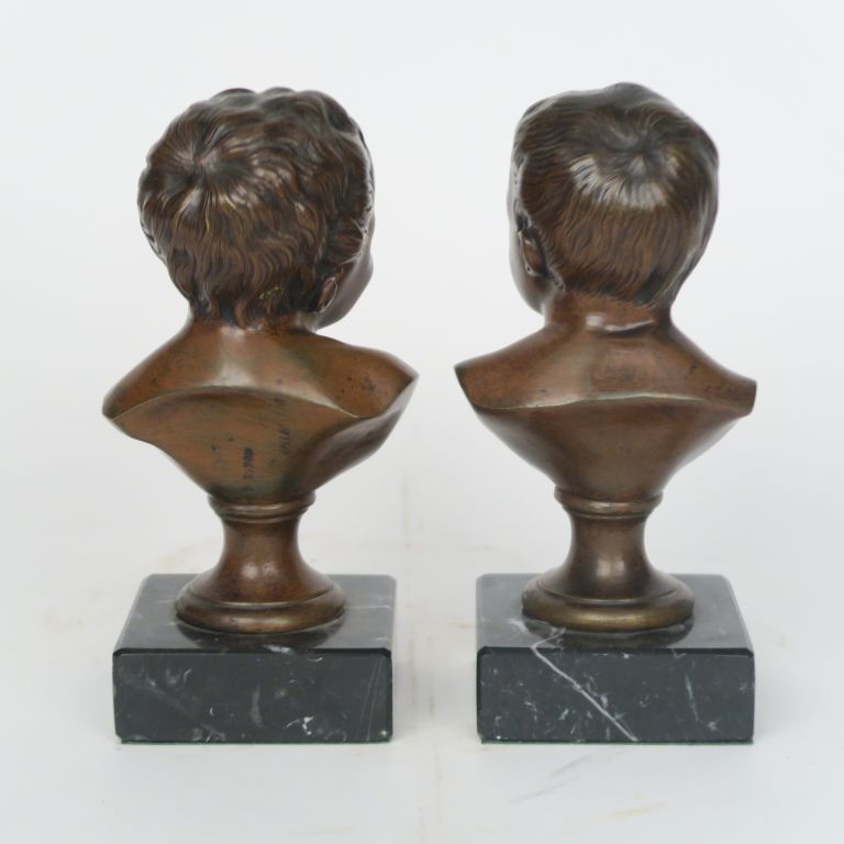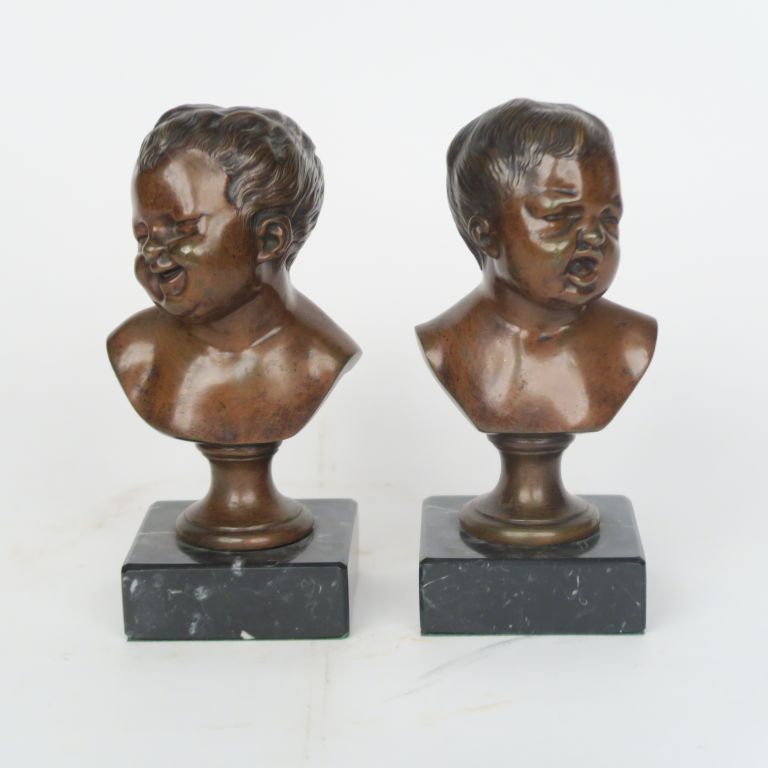 Ecole française fin XIX ème. "Jean qui rit, Jean qui pleure." Paire de sujets en bronze à patine médaille sur des socles en marbre noir. H.(des sujets) 16 cm.