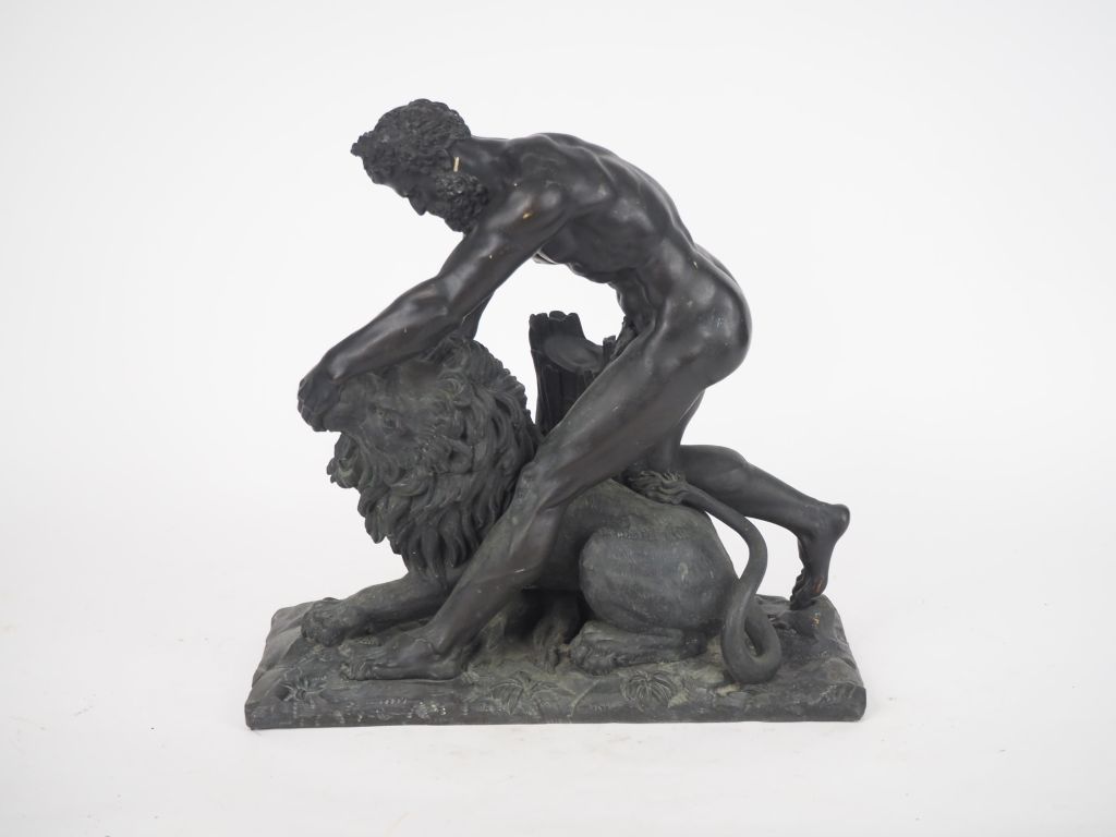 Ecole française XIXème. "Héraclès et le lion de némée". Groupe en bronze, à patine noire. Dim. 35 x 13,5 x 16,5