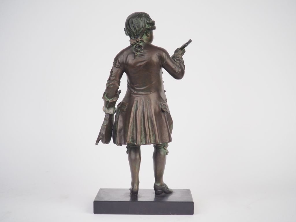 Ecole française XXème. "Mozart". Sculpture en régule à patine brune et verte, socle en marbre noir H. 29 cm.