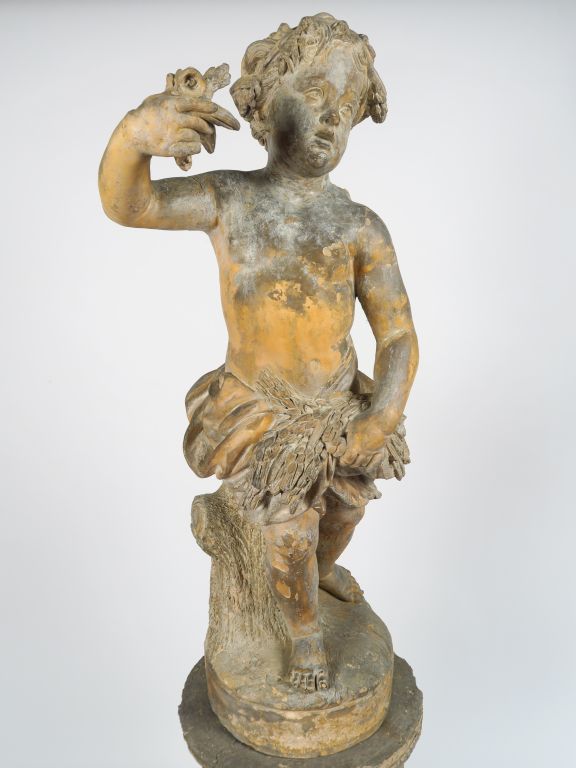 Enfant personnifiant l’Eté en terre cuite ronde-bosse avec restes de monochromie couleur pierre. Debout contre un tronc placé derrière lui, la tête ceinte d’une couronne de fleurs, il tient des fleurs dans sa main droite levée et des épis de blé de l’autre. Socle en forme de colonne ornée d’une guirlande de fleurs tenue par un ruban avec frise de fleurons à la partie supérieure. Première moitié du XVIIIème siècle. H. 100 cm H. totale : 187 cm (quelques accidents et fissures) Expert : Laurence Fligny