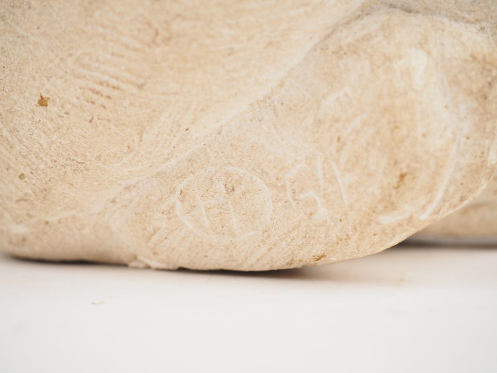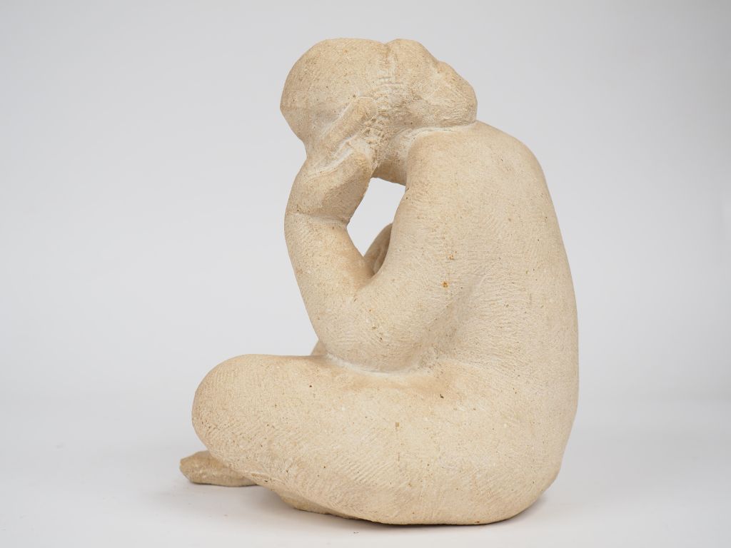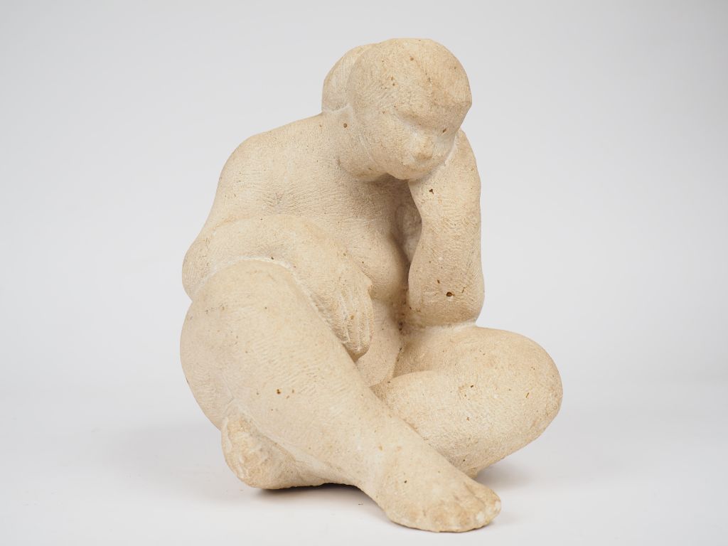 Eugène-Henri DULER "Jeune femme assise" Sujet en pierre. Signé du monogramme et daté 1954. H. 23, cm