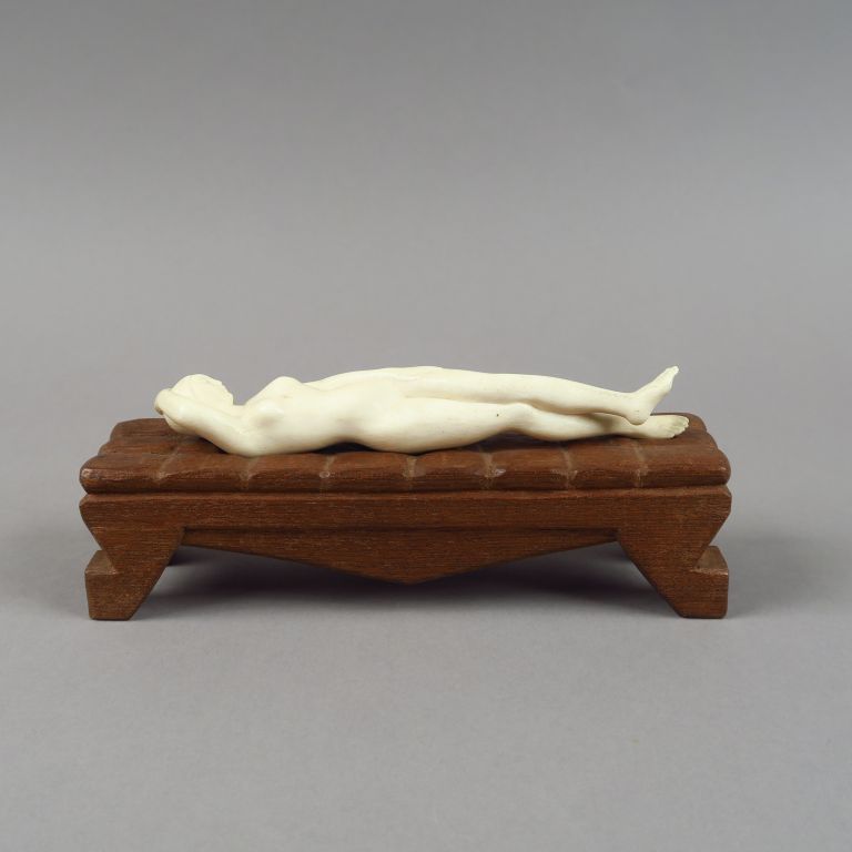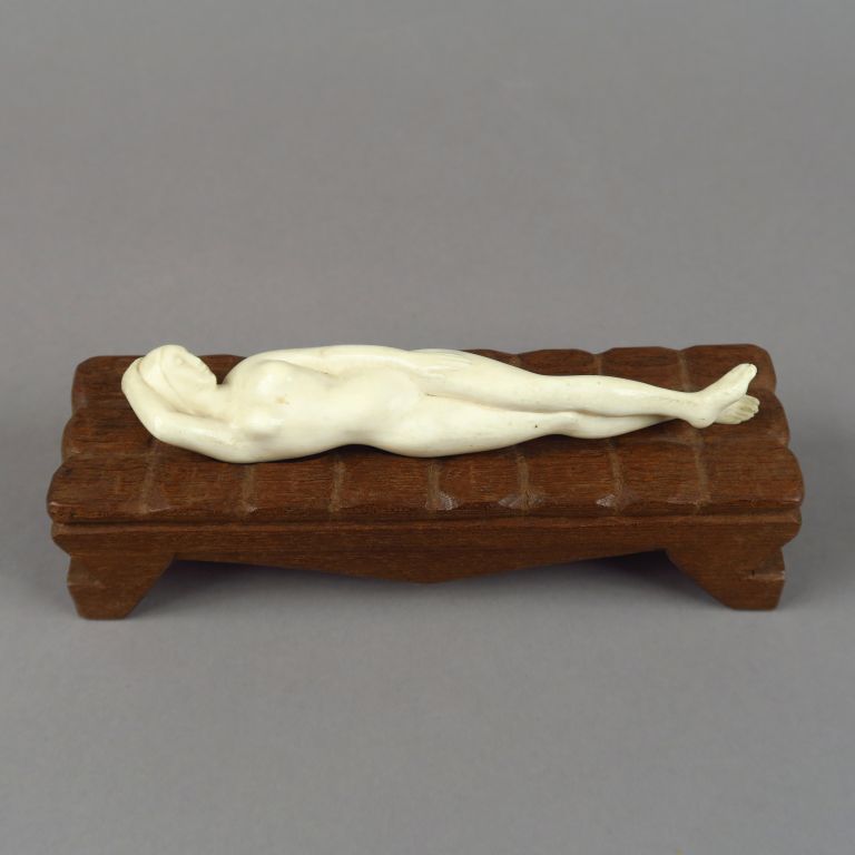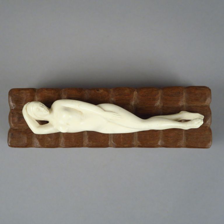 Ferdinand PARPAN "Femme allongée" Sculpture en ivoire. Sur un socle en bois. Monogrammée. Dim. de la sculpture : 19,5 x 4 cm Dim. du socle : 5,5 x 22,5 cm