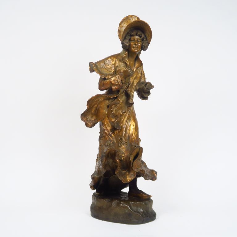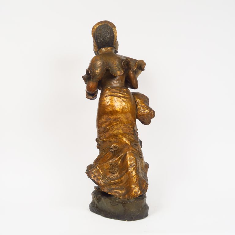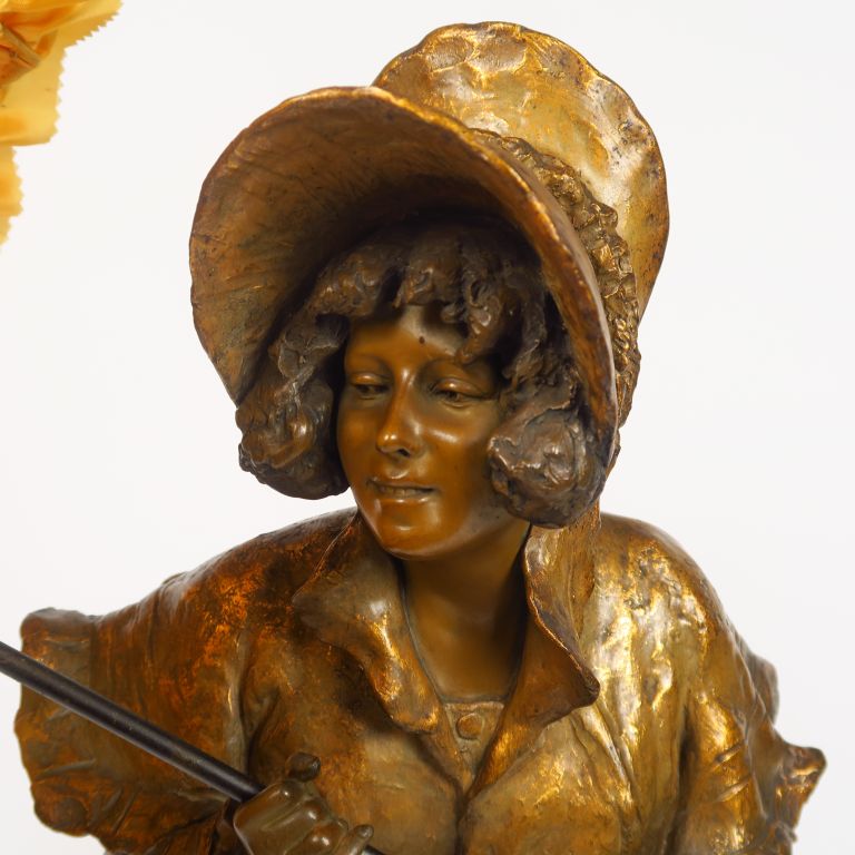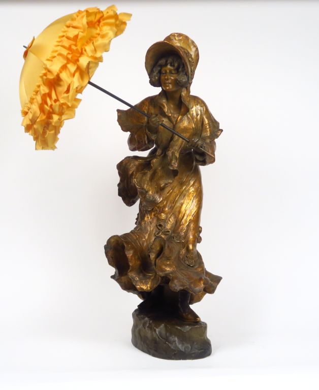 GOLDSCHEIDER "Jeune fille à l'ombrelle" Sculpture Art Nouveau en stuc polychrome et doré. H. 74 cm (petites restaurations)