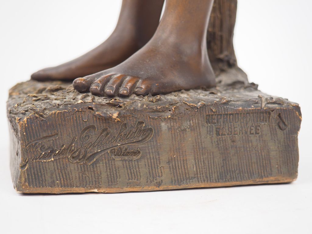 GOLDSCHEIDER "Le pêcheur" Sujet en stuc polychrome. Signé. H. 58 cm (restaurations ?)