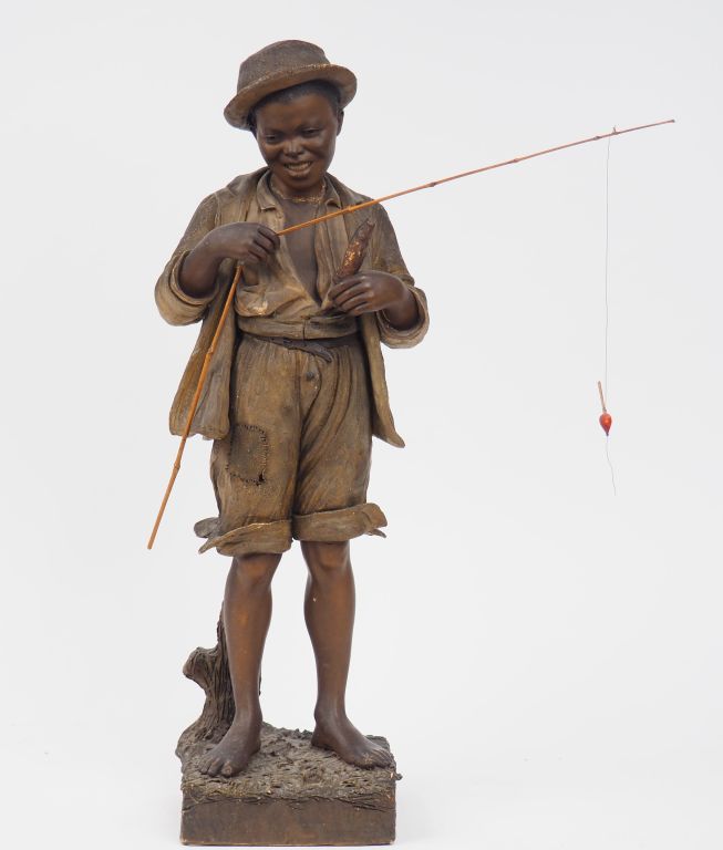 Lot de GOLDSCHEIDER "Le pêcheur" Sujet en stuc polychrome. Signé. H. 58 cm ( au prix de 350 à 400 € en vente aux enchères par l'hôtel des ventes Primardeco