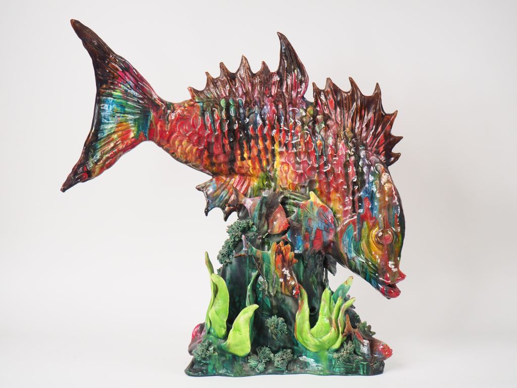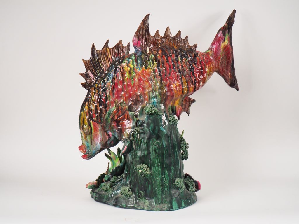 Grand groupe en céramique de Vallauris "poissons et plantes aquatiques". (extrémité droite de la queue du grand poisson cassée et recollée, petits accidents) H. 67,5 x 88 cm (diagonale)