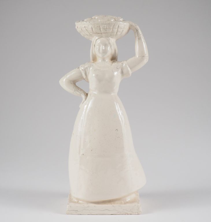 Henri Paul REY. "jeune fille au panier de fruits" Sculpture en terre vernissée ivoire Signée H. 28 cm