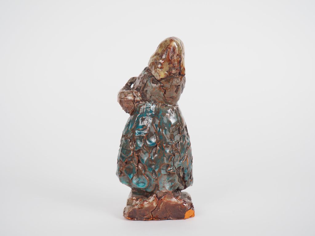 Henri Paul REY. "jeune fille au panier" Sculpture en terre cuite vernissée polychrome signée H. 18,5 cm (petite égrenure à l'arrière de la terrasse)