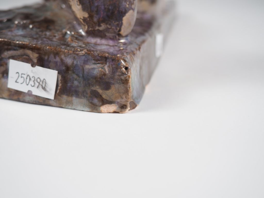 Henri Paul REY. "jeune fille nue allongée" Sculpture en terre cuite irisée Signée Dim. 14 x 27,5 x 9,5 cm